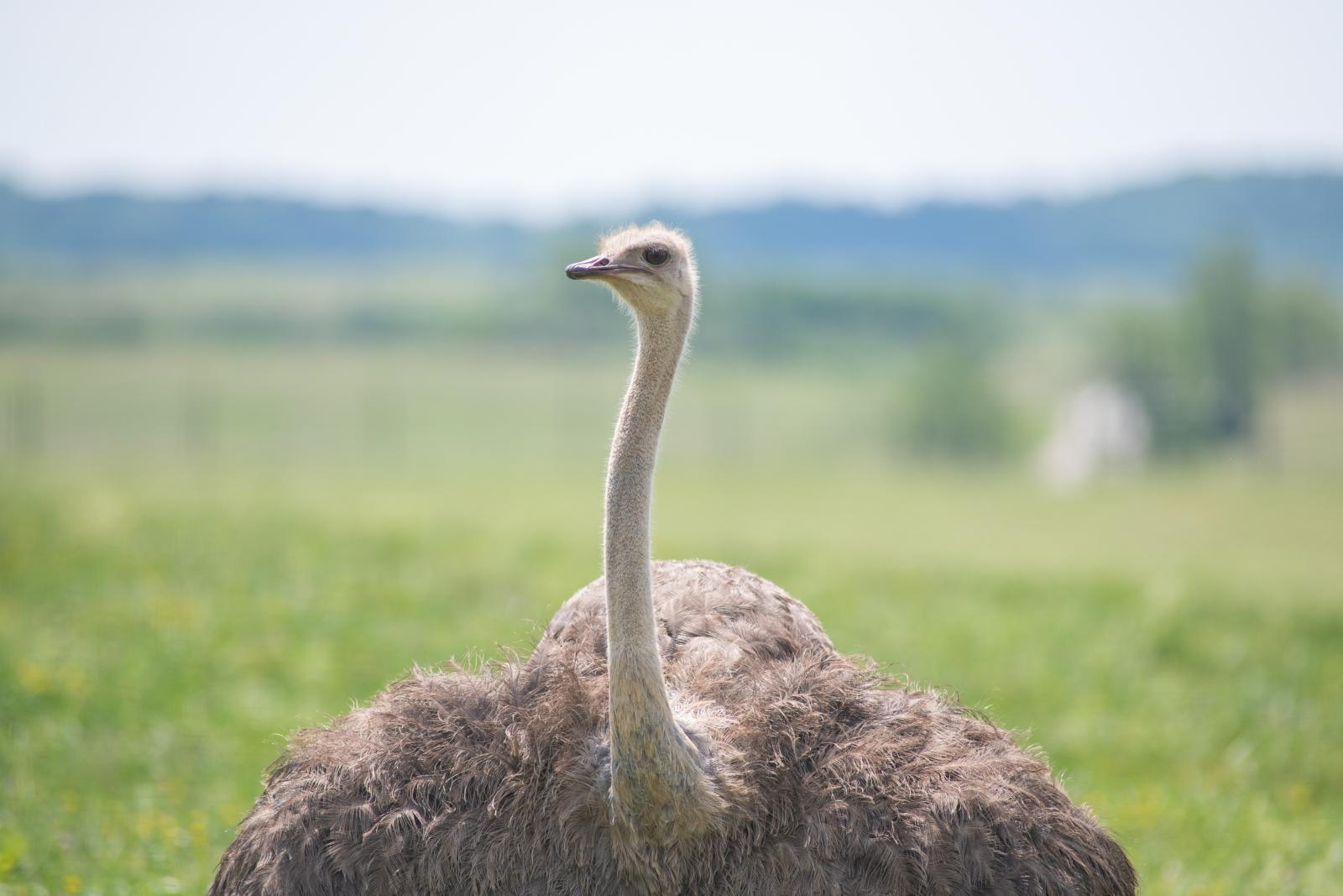 Ostrich cannot fly but use their wings for balance as they run at speeds up to 43 mph. They have the largest eyes of any land animal. An ostrich's eyes are larger than its brain.