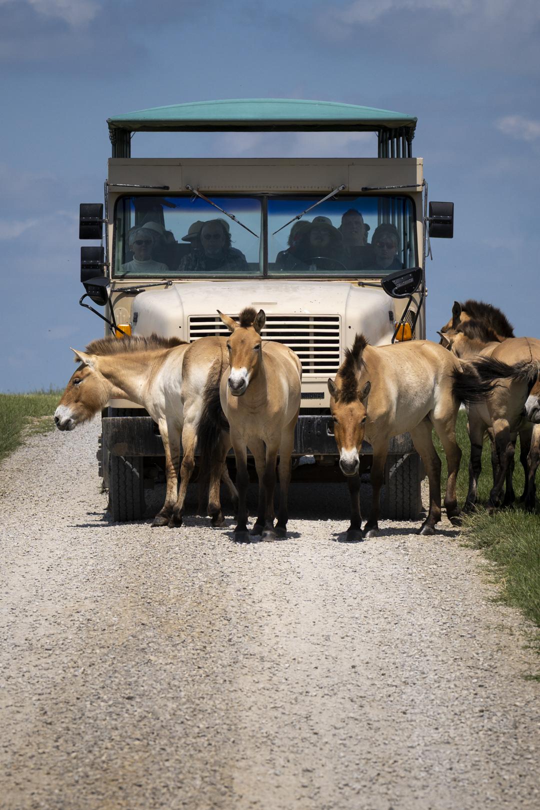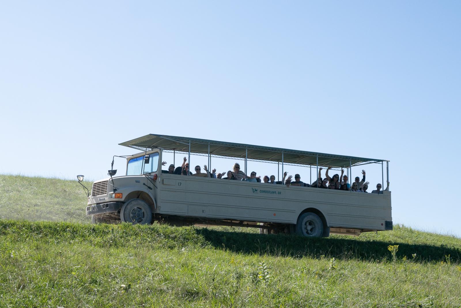 You'll climb onto a tour bus and set out into vast pastures. Keep your camera near you, because you'll be driving by giraffe, camels, bison, painted dogs, zebras, Przewalski's wild horses, rhinos, banteng, and many more! Our friendly tour guides know The Wilds like the back of their hand, and they'll spot the animals roaming our 10,000 acres and stop the bus to tell you stories about them. It's an amazing experience you won't forget!